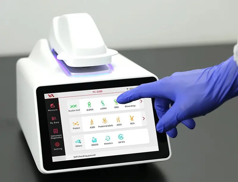 • Pour la mesure de concentration d'acides nucléiques, de protéines, de cultures bactériennes (FC-2100, FC-3100)... • Dosage en microvolumes (volume minimum 0,5 µl) et également en cuvette pour les modèles FC • Le module de la cuvette des modèles FC est thermostaté à 37 °C et possède une fonction d'agitation (10 à 900 rpm) • Gamme continue de longueurs d'onde (modèles FC-3100 et F-3100) ou 5 longueurs d'onde fixes (modèles FC-2100 et F-2100) • Contrôle intuitif via un écran tactile 7" avec système d'exploitation Android • Mesure rapide en seulement 5 secondes et affichage des résultats en temps réel • Stockage des données dans un historique avec possibilité d'exportation vers PC (USB/Wi-Fi) • Dispositif compact, facilement transportable • Gamme de longueurs d'onde pour les modèles F-3100 et FC-3100 : 185-910 nm (UV-Visible) • Longueurs d'onde fixes pour les modèles FC-2100 et F-2100 : 230,260,280,350 et 600 nm • Gamme photométrique microvolume : 0.04-550 A (équivalent 10 mm) • Intervalle de concentration microvolume : ADNdb [2-27500 ng/µl], BSA [0.06-820 mg/ml], IgG [0.03-400 mg/ml] • Gamme photométrique cuvette (FC-2100, FC-3100) : 0-1.5 A • Limite de concentration en cuvette : dsDNA 0.2 ng/µL ; BSA 0.006 mg/ml • Stockage interne : 32 GB • Poids net : 2,3 kg