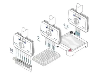 • Espacement de pointe ajustable au choix entre 4,5 et 33 mm, selon le modèle de pipette