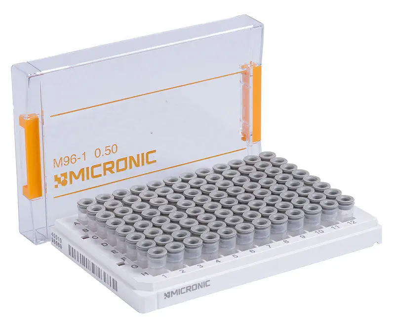 944418 · Micronic 96-1 Storage rack with low lid - For 0.30 ml tubes external thread and 0.50 ml tubes internal screw thread with TPE cap or low profile screw