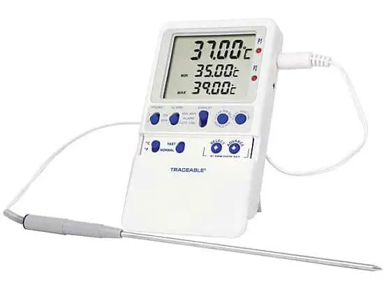 • Thermomètre numérique traçable de haute précision avec étalonnage, 37 °C ; 1 sonde en acier inoxydable • Offre des lectures exactes requises pour les hautes exigences, les contrôles de qualité et les mesures de routine • Les unités lisent 0,00, 25,00, 37,00 ou une combinaison des trois avec une résolution de 0,01° et une précision de ±0,05 °C à ±2 °C de la norme • Unités lues en °C et °F