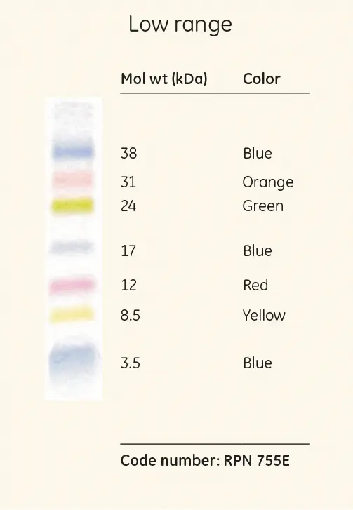 • RPN755E : protéines de 3,5 à 38 kDa, utilise 7 protéines et 5 couleurs différentes, suffisant pour 50 mini gels. Transférable sur membranes.