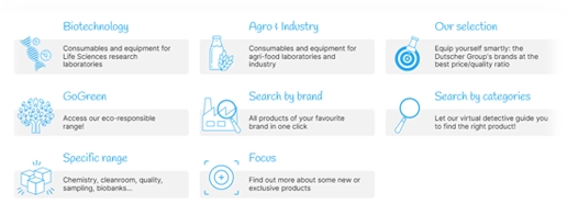When you do a keyword search, depending on the nature or level of detail of your query, an assistant will suggest how you can refine your search to give you the best results. The final results page will show filters that allow you specify your needs on certain specific criteria: GOOD DEALS (special offers) / GOGREEN (respectful of the environment) / BEST SELLER / OUR SELECTION (Dutscher’s own brand).